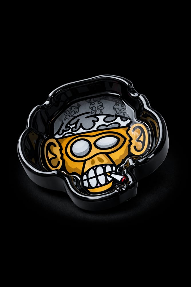 This ashtray, in the shape of a monkey's head, is inspired by Thailand. Made of black ceramic, it represents a stylized monkey with cartoon features, a cigarette in its mouth, and a beanie. The humorous and exaggerated details recall local pop culture influences, while alluding to the sad reality of monkeys in Thailand who are sometimes encouraged to smoke by tourists. An object that is both playful and provocative, it also serves as a warning about irresponsible interactions between humans and animals.
